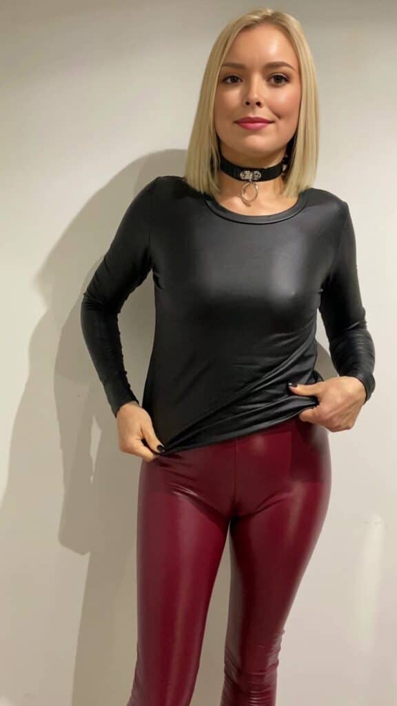 Muse adore mettre ses formes en valeur à travers ses leggings en cuir. Elle est intégralement épilée et revendique la douceur et la beauté de sa vulve.
